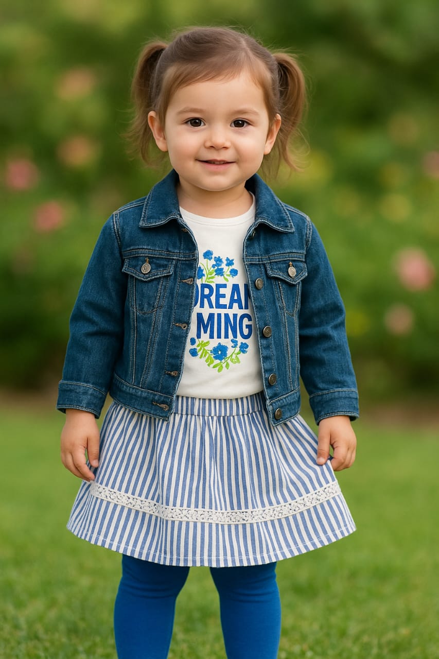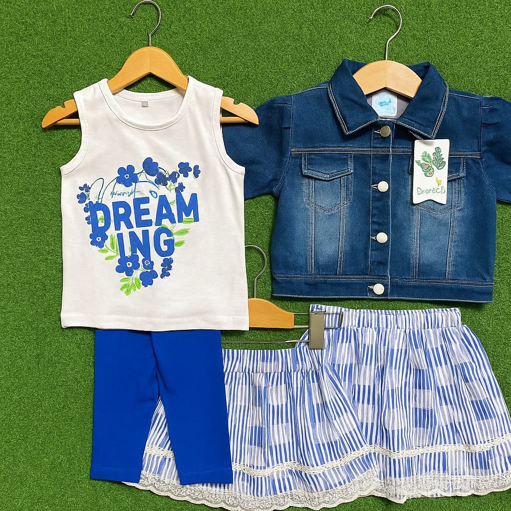 This baby girl denim dress set by Little Champs includes four essential pieces featuring a stylish denim jacket perfect for layering. Designed with soft, durable fabric, it offers comfort and ease of movement for active little ones.
